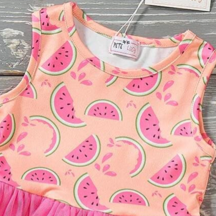 Our gorgeous Pink Watermelon Tulle Dress will have you wanting a slice of sweet watermelon this summer! Slices of watermelon on a peachy background is paired with a vibrant and colorful pink tulle skirt that sings Summer is here!