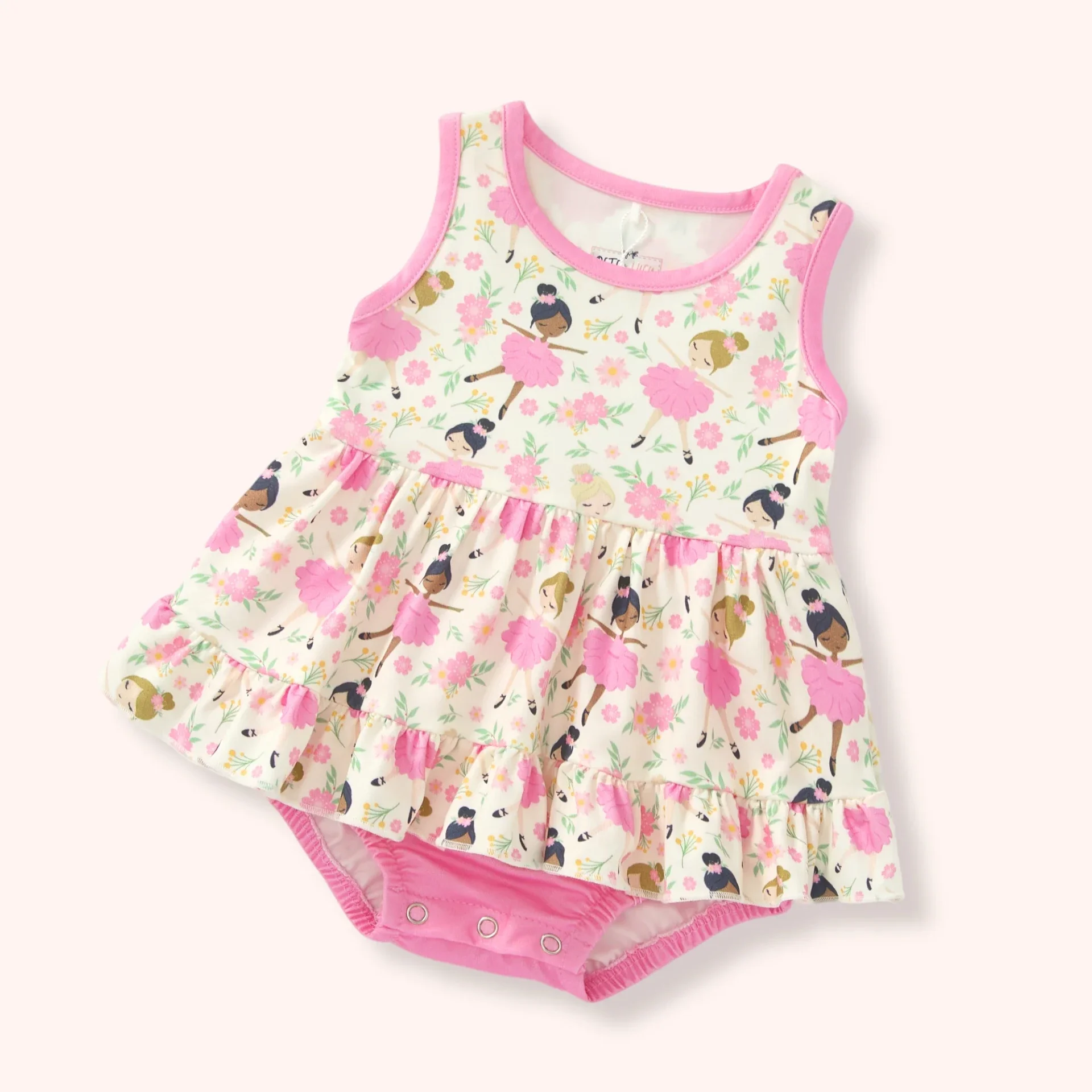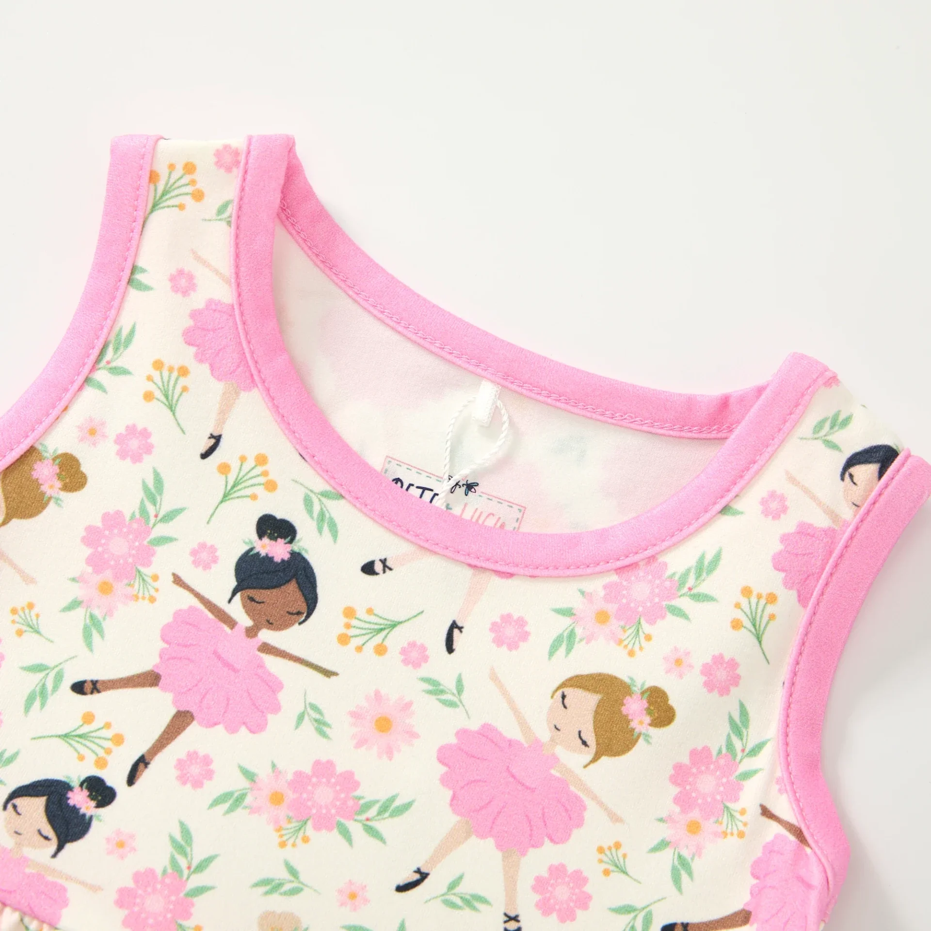 Our Princess Pirouette Romper will have your little one dancing across the room! Adorned with beautiful ballerinas and fanciful flowers, this cute and cuddly romper will keep your little one cool and comfortable! Complete with matching bottoms for your baby's ultimate comfort in the Summer heat!
